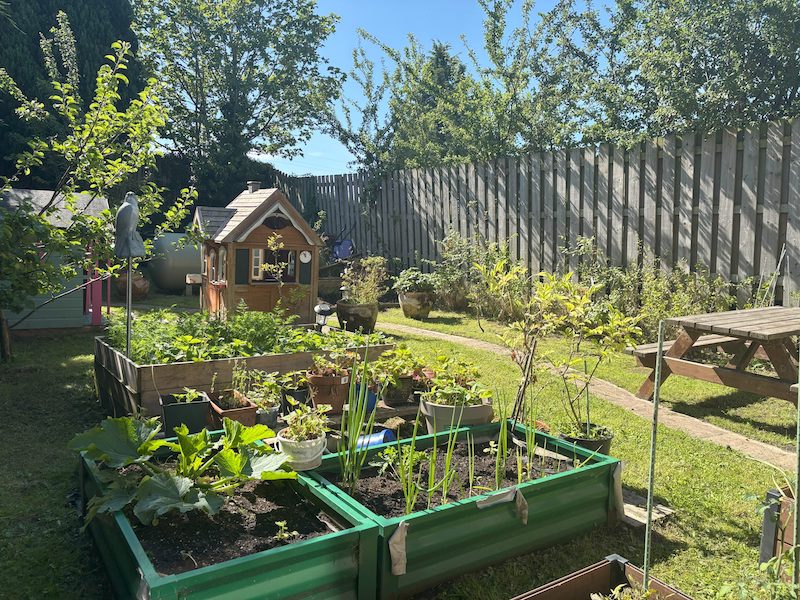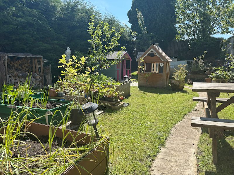 The gardens are a defining feature of the property, with the front garden carefully planted and arranged to create multiple seating areas, raised beds, and fruit trees.