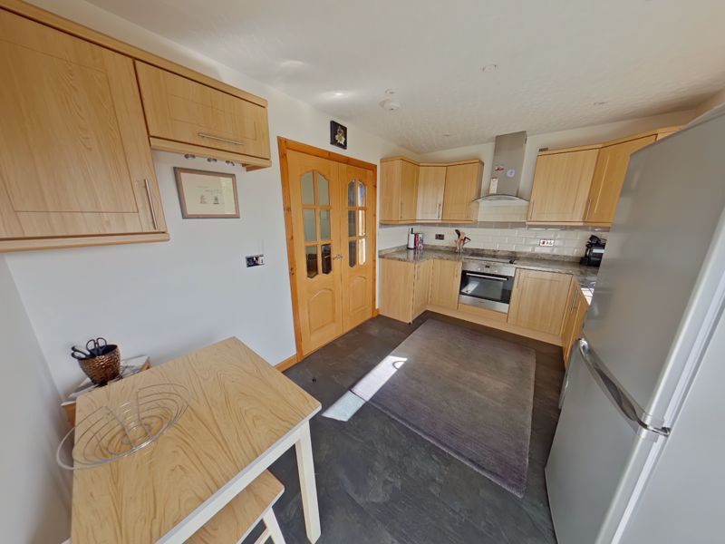 From here double doors lead through to the kitchen and dining area, a practical space fitted with modern units and room for a small dining table.