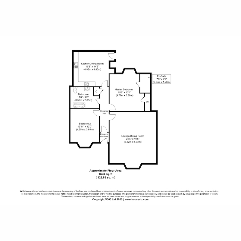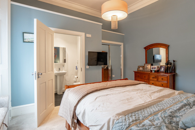 The principal bedroom benefits from its own en suite, finished simply and cleanly, while the main bathroom carries a more expressive feel through its monochrome detailing.