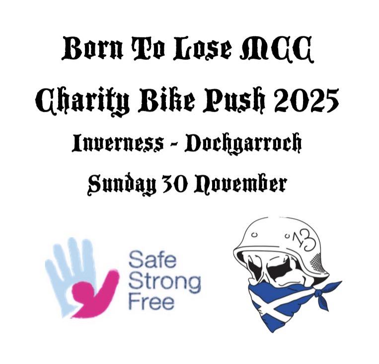 Born To Lose MCC will take on a 35 stone motorcycle push from Inverness to Dochgarroch on 30th of November to raise funds for the Highland child abuse prevention charity Safe Strong and Free.