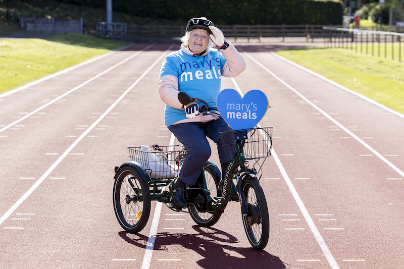 The great grandmother has completed her third fundraising challenge for Marys Meals, cycling thirty miles around a racetrack on her tricycle over three days to mark the charity’s remarkable milestone of feeding three million children every school day.