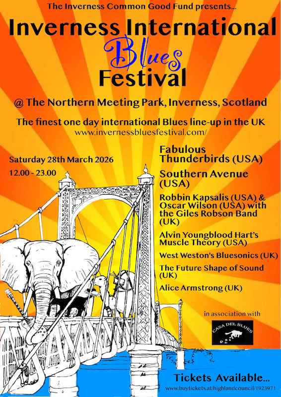 The Inverness International Blues Festival runs from 12.00pm to 10.30pm on Saturday 28 March 2026 at Northern Meeting Park.