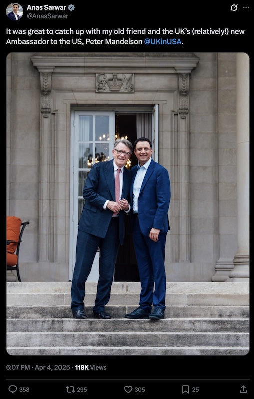 According to the dossier, Sarwar publicly promoted his close friendship with Mandelson in a social media post on 4th of April 2025, despite Mandelson’s continued association with convicted sex offender Jeffrey Epstein being a matter of public record for several years.